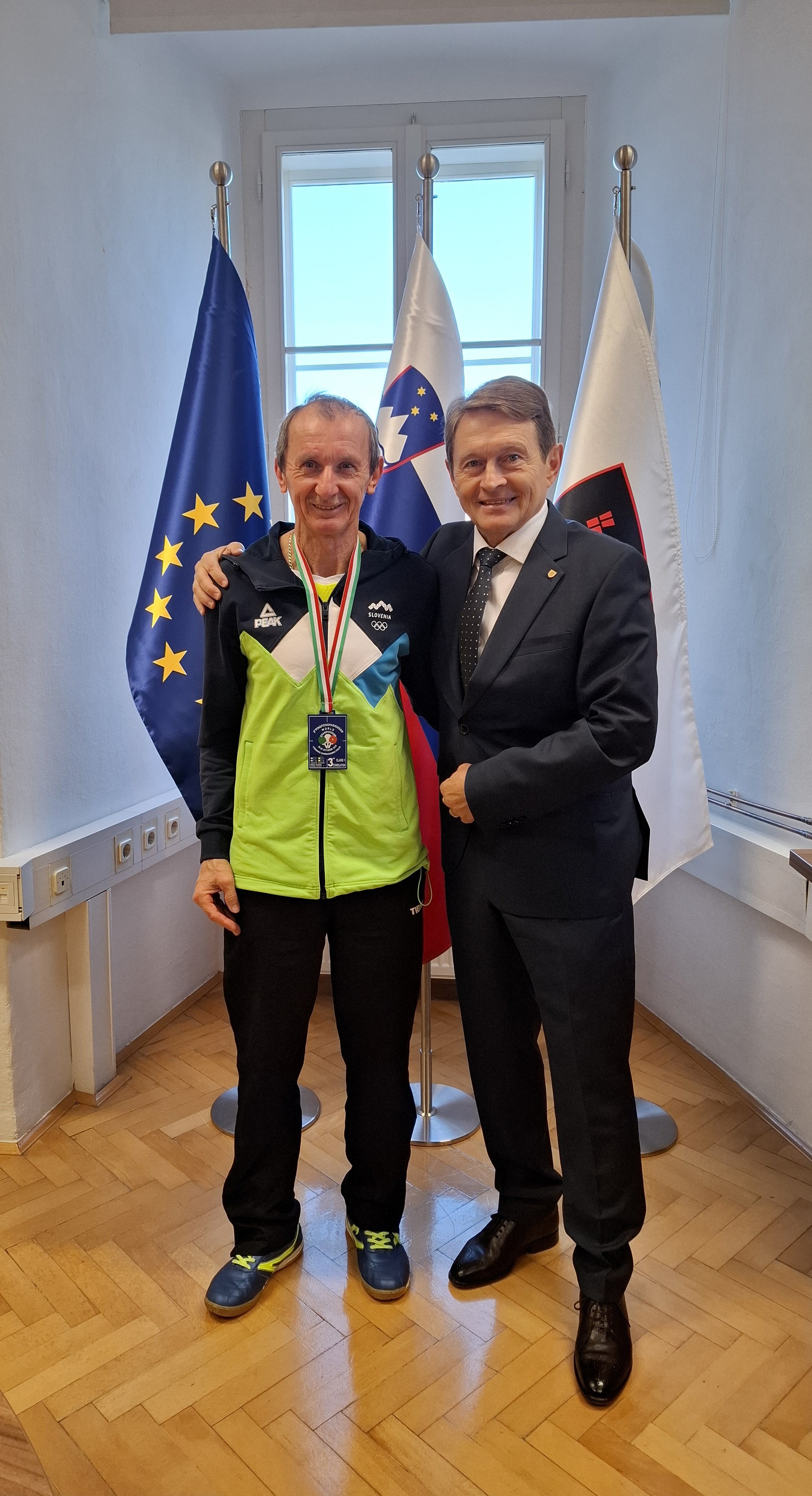 Župan Občine Črnomelj Andrej Kavšek je danes sprejel Jurija Kureta iz Dolenjih Radencev in mu čestital za izjemen uspeh na 6. svetovnem prvenstvu v namiznem tenisu za osebe s Parkinsonovo boleznijo, ki je potekalo v italijanskem Lignanu. V močni mednarodni konkurenci je osvojil tretje mesto in bronasto medaljo, kar je še en pomemben mejnik v njegovi športni poti.