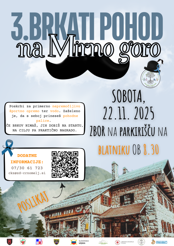 Nazaj 3. Brkati pohod na Mirno goro 22.11.2025 / 08:30 / Blatnik pri Črmošnjicah Vabljeni na 3. Brkati pohod na Mirno goro, ki bo v soboto, 22. novembra. Štart pohoda bo ob 8.30 iz Blatnika pri Črmošnjicah.