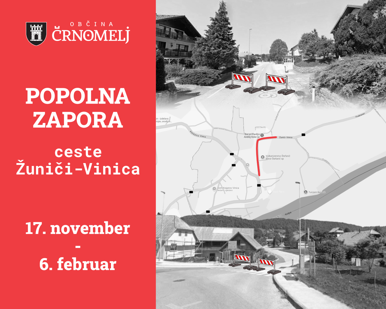 Obveščamo vas, da bo na cesti Žuniči - Vinica od 17. novembra 2025 do 6. februarja 2026 popolna zapora zaradi del.