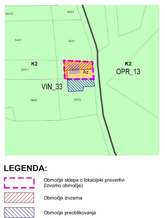 Lokacijska preveritev se nanaša na enoto urejanja prostora z oznako VIN_33, ki je opredeljena kot površine razpršene poselitve, na parcelah št. 543/4 in 543/3, obe v k.o. 1552 – Adlešiči.
